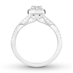 This stunning engagement ring effortlessly combines romantic and modern styles for a design they will love. Round diamonds halo a sparkling diamond in the center, while graceful twists of diamonds form the band. The 14K white gold ring has a total diamond weight of 5/8 carat.